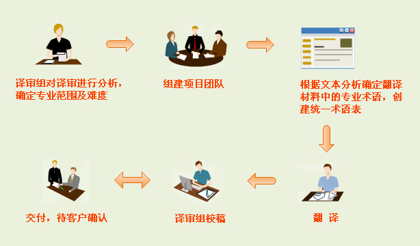 (1)项目分析:由一名高级翻译牵头对收到的稿件内容进行初步分析,确定专业范围和难易程度;